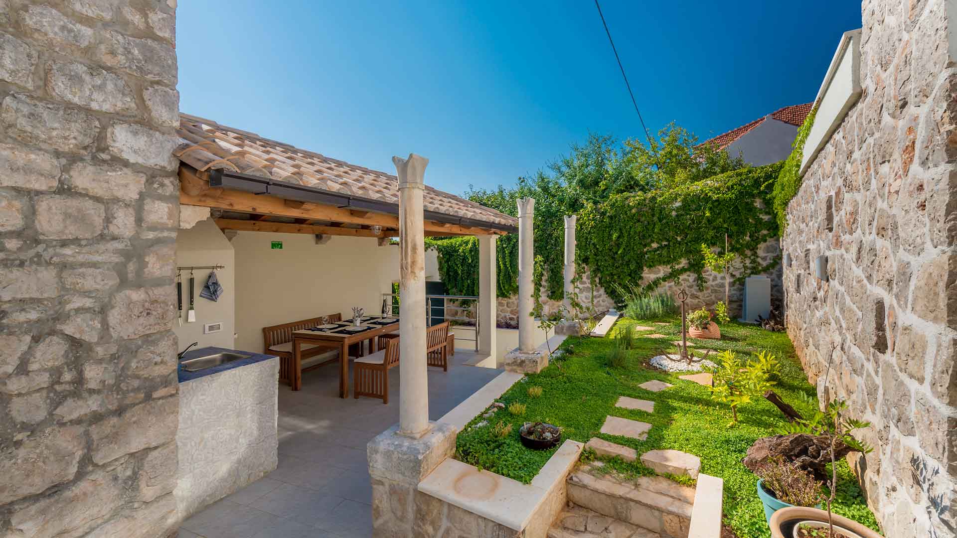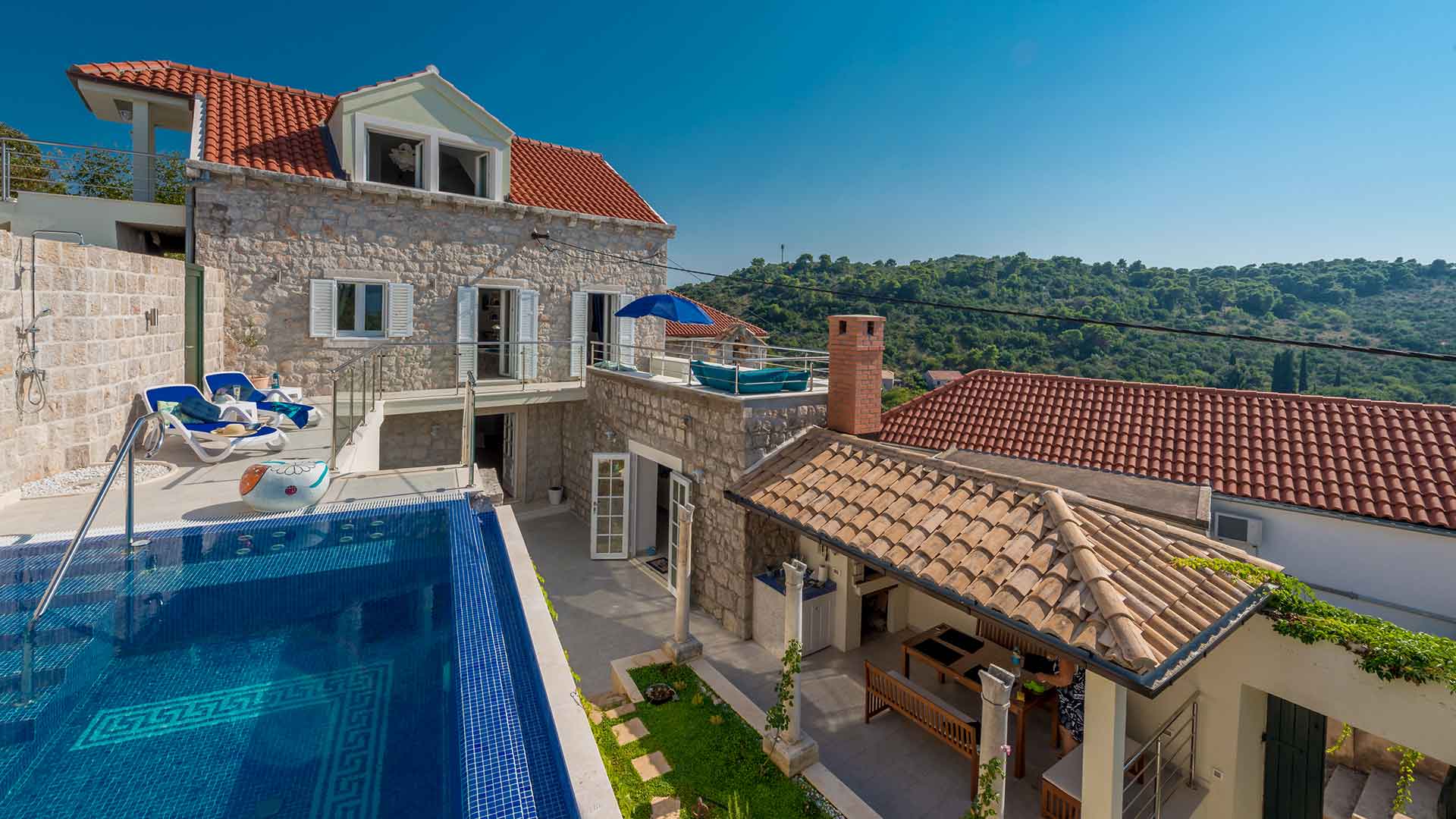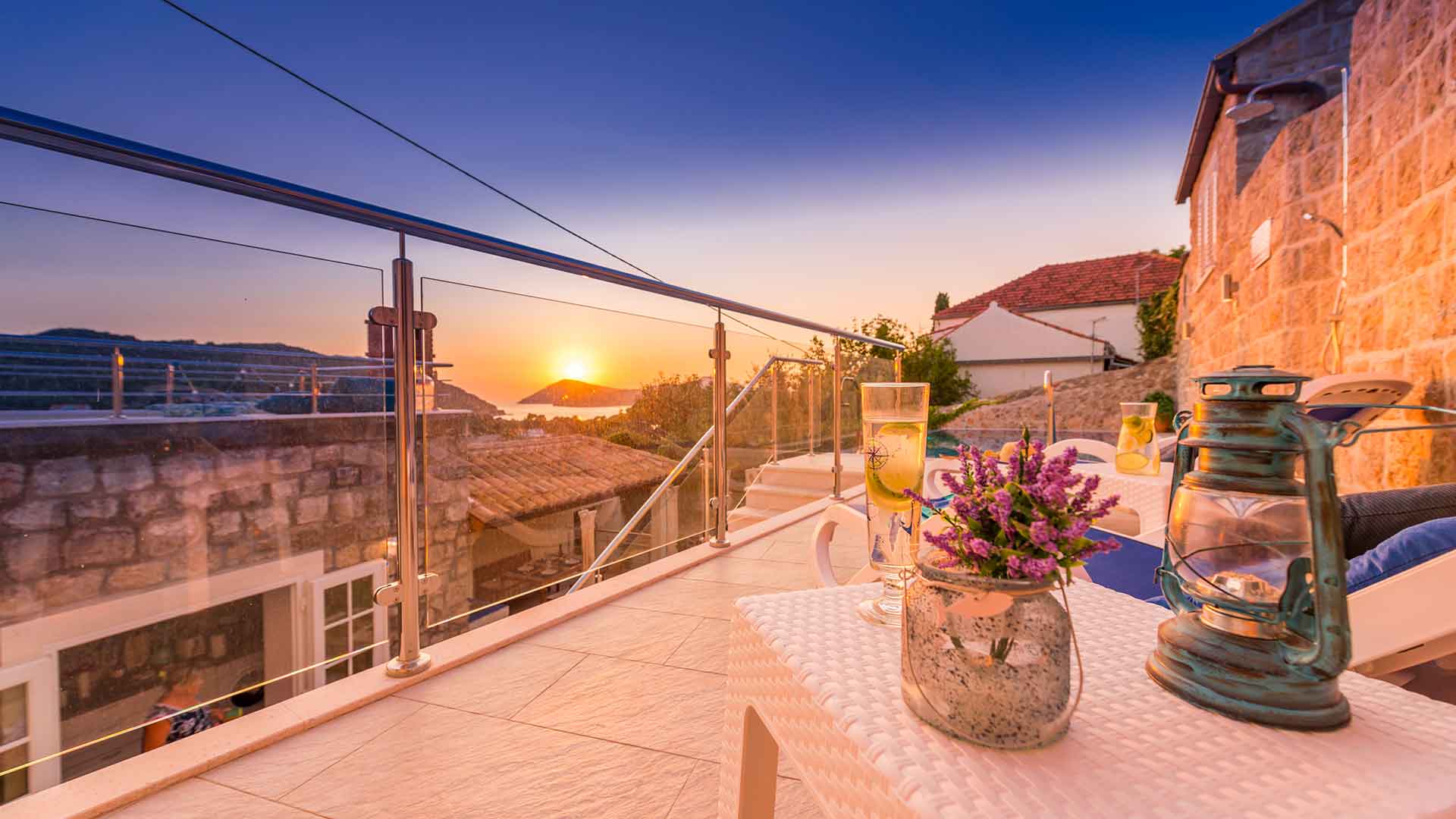 Stunning and luxurious, Villa Baburizza is a newly refurbished 400 hundred years old stone house into four star housing located next to a 14th century church at the top of the village of Donje Čelo on the Island of Koločep. It is furnished and decorated in Mediterranean taste of blue and white as an echo of the sea and sky and stone in a unique blend of traditional and modern. It boasts amazing panoramic sea views sunsets to the bay, island of Lopud and beyond.