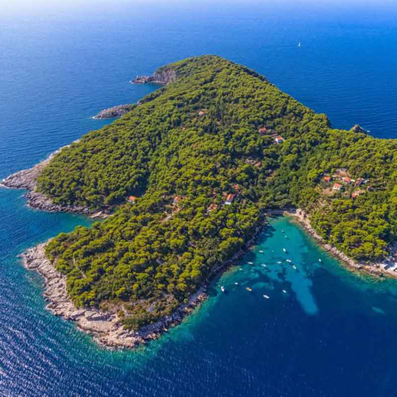 It has a surface area of 2.35m2 and is 3 Nm northwest of Dubrovnik. The island is made up of limestone and dolomite rock. There are no water sources or streams, and only subterranean waters are used. There are two settlements on the island with sandy and pebbly beaches, Gornje and Donje Celo, which offer excellent conditions for enjoyment of the clear and clean sea. The east and west sides are covered in dense pine forest. (TZ Dubrovnik)